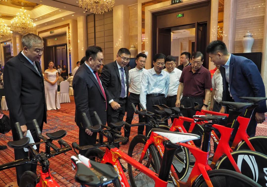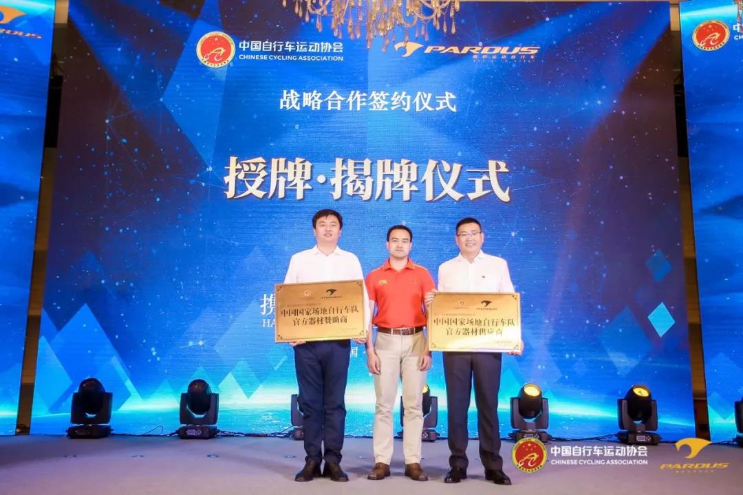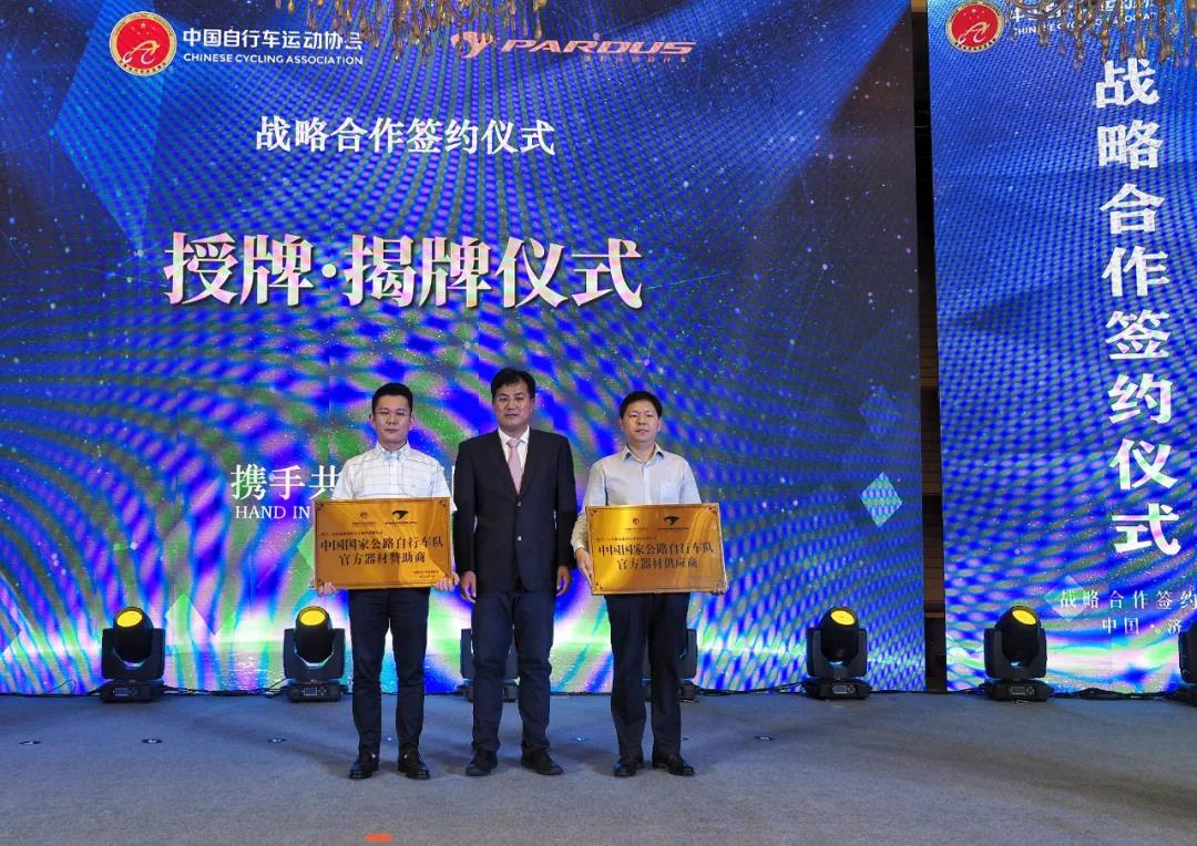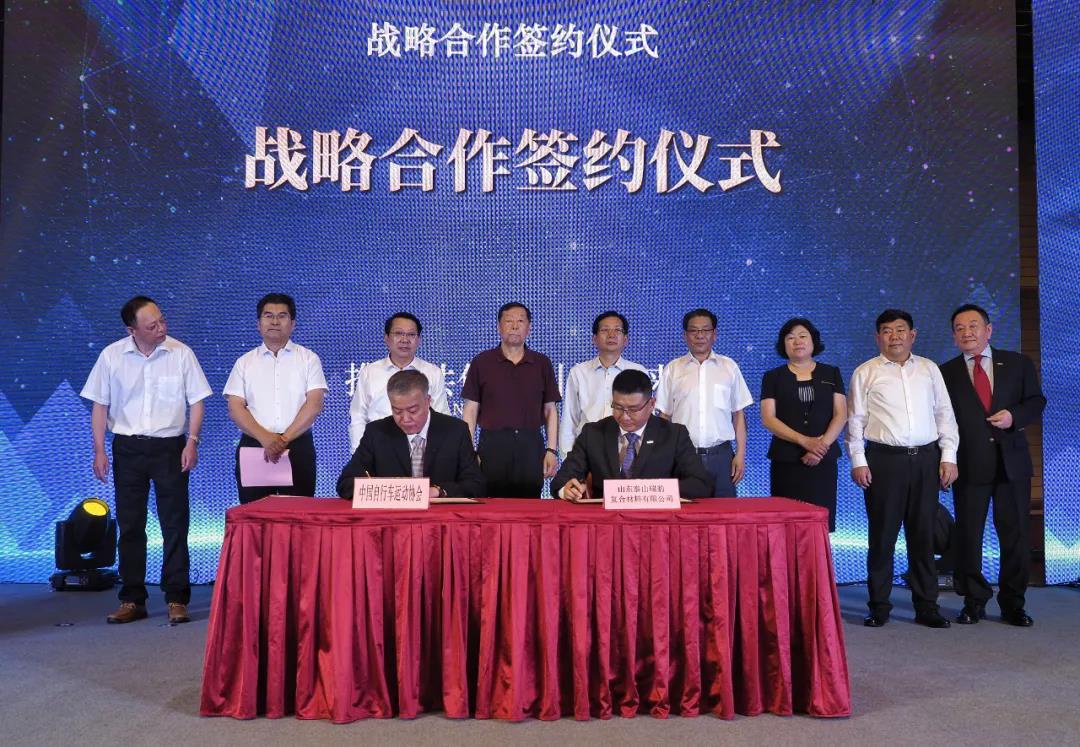 仪式上,中国自行车运动协会与泰山瑞豹复合材料公司签订战略合作协议,标志着泰山瑞豹正式成为中国国家队公路自行车、场地自行车这两个项目的器材赞助商和器材供应商。
