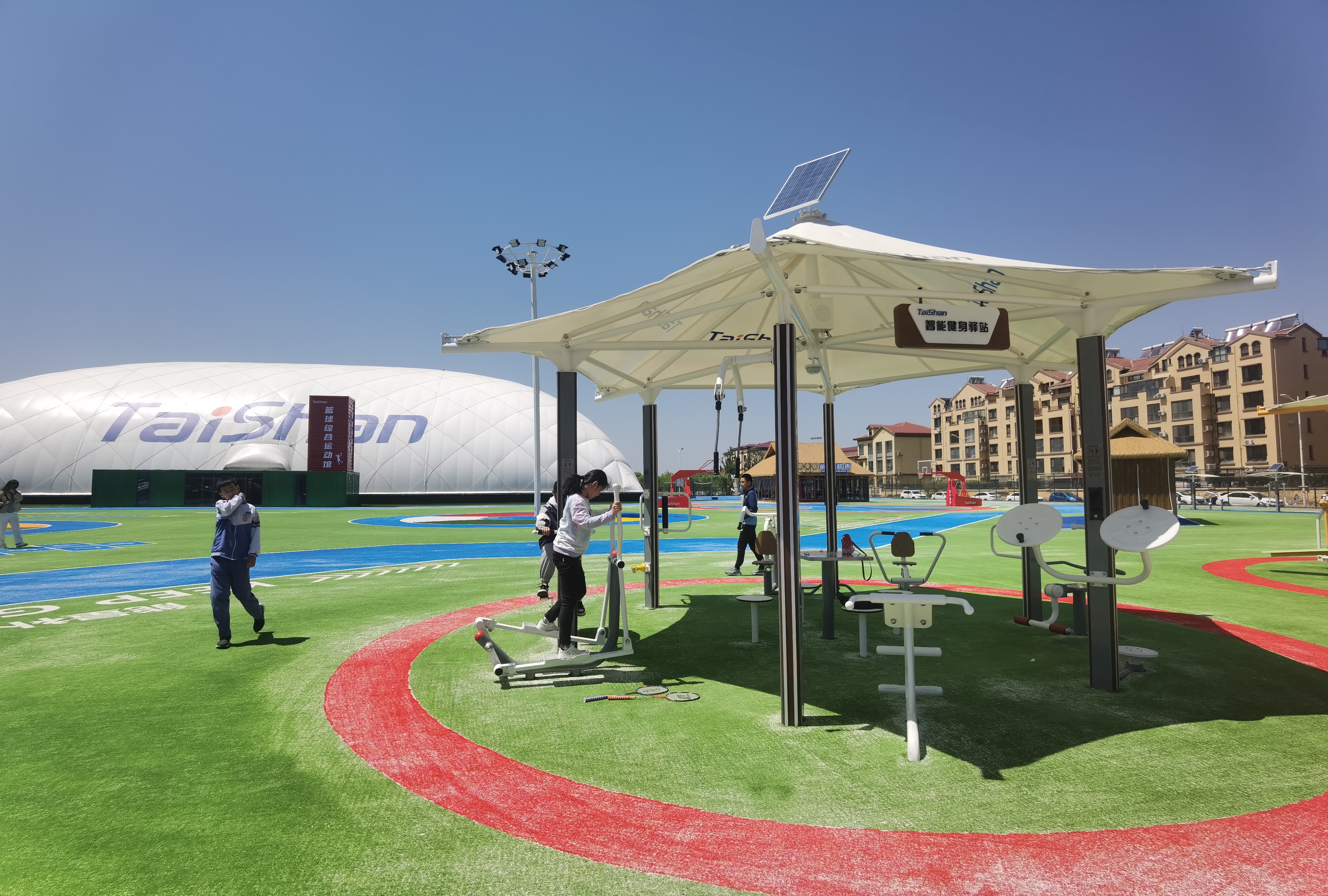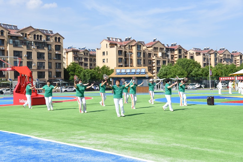 在场地铺设上,均采用泰山新材料功能人造草铺设,全方位保证运动安全和环保;气膜式篮球综合运动馆,内部设置2片篮球场、6片乒乓球场地及1片网球场。网球场同时套线4个羽毛球场地。场馆内可以满足体育运动,体育教学及群众比赛需求。从场馆到运动超市、智慧体测小屋,全部采用可装配式建筑。